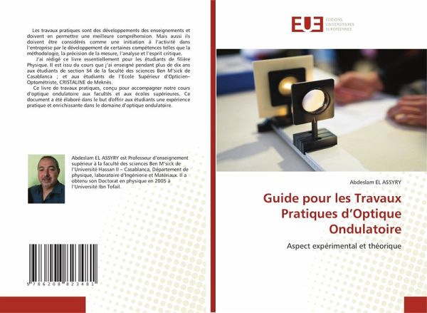 Les travaux pratiques sont des développements des enseignements et doivent en permettre une meilleure compréhension. Mais aussi ils doivent être considérés comme une initiation à l'activité dans l'entreprise par le développement de certaines compétences telles que la méthodologie, la précision de la mesure, l'analyse et l'esprit critique. J'ai rédigé ce livre essentiellement pour les étudiants de filière Physique. Il est issu du cours que j'ai enseigné pendant plus de dix ans aux étudiants de section S4 de la faculté des sciences Ben M'sick de Casablanca ; et aux étudiants de l'Ecole Supérieur d'Opticien-Optométriste, CRISTALINE de Meknès. Ce livre de travaux pratiques, conçu pour accompagner notre cours d'optique ondulatoire aux facultés et aux écoles supérieures. Ce document a été élaboré dans le but d'offrir aux étudiants une expérience pratique et enrichissante dans le domaine d'optique ondulatoire.
