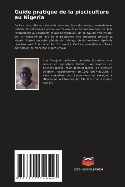 Ce livre sera utile aux étudiants en aquaculture des niveaux secondaire et tertiaire. Il contribuera à promouvoir l'aquaculture en tant qu'entreprise. Je le recommande aux étudiants et aux pisciculteurs. On ne saurait trop insister sur la nécessité de faire de la pisciculture une entreprise agricole au Nigeria. Surtout en cette période de chômage où de nombreux diplômés nigérians sont à la recherche d'un emploi. Ce livre permettra aux futurs agriculteurs de créer leur propre emploi.