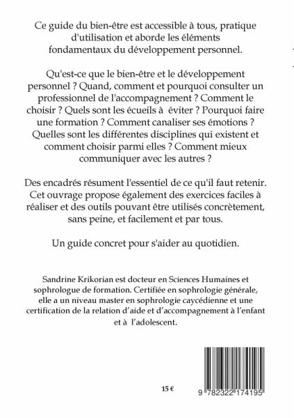 Ce guide du bien-être est accessible à tous. Pratique d'utilisation, il aborde les éléments fondamentaux du développement personnel. Il répond de façon synthétique et concise aux questions de base que l'on peut se poser (professionnels, disciplines...). Des encadrés résument l'essentiel de ce qu'il faut retenir. Cet ouvrage propose également des exercices faciles à réaliser et des outils pouvant être utilisés concrètement, sans peine, facilement et par tous. Un guide concret pour s'aider au quotidien.