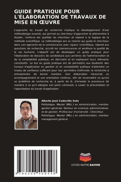 L'approche du travail de recherche implique le développement d'une méthodologie ouverte, qui permet au chercheur d'approcher le phénomène à étudier, renforce les qualités du chercheur et répond à la logique de la méthode scientifique. La méthodologie est un chemin qui guide le chercheur dans son approche de la connaissance avec rigueur scientifique, répond aux questions de recherche, accroît les connaissances et améliore la qualité de la vie humaine. L'objectif est de développer un guide pratique pour l'élaboration de dossiers de candidature aux carrières de l'administration et de la comptabilité publique, en décrivant et en expliquant leurs éléments constitutifs. Le but du guide pratique est de permettre aux étudiants des travaux d'application en gestion et en comptabilité publique d'atteindre un niveau de confiance suffisant pour leur permettre d'affronter la recherche à entreprendre de bonne manière. Son élaboration nécessite un accompagnement et une orientation continus, afin de reconnaître ce qu'est un problème de recherche et, à partir de là, d'orienter le processus de manière à ce qu'il atteigne son point culminant, à savoir la présentation et l'approbation du travail d'application.