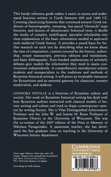This handy reference guide makes it easier to access and understand histories written in Greek between 600 and 1480 CE. Covering classicizing histories that continued ancient Greek traditions of historiography, sweeping, fast-paced 'chronicle' type histories, and dozens of idiosyncratic historical texts, it distills the results of complex, multi-lingual, specialist scholarship into clear explanations of the basic information needed to approach each medieval Greek history. It provides a sound basis for further research on each text by describing what we know about the time of composition, content covered by the history, authorship, extant manuscripts, previous editions and translations, and basic bibliography. Even-handed explanations of scholarly debates give readers the information they need to assess controversies independently. A comprehensive introduction orients students and non-specialists to the traditions and methods of Byzantine historical writing. It will prove an invaluable timesaver for Byzantinists and an essential entry point for classicists, western medievalists, and students.