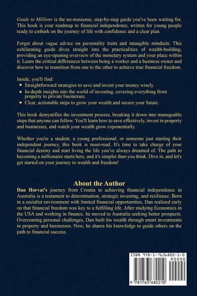 "Guide to Millions" is the no-nonsense, step-by-step guide you've been waiting for. This book is your roadmap to financial independence, written for young people ready to embark on the journey of life with confidence and a clear plan. Forget about vague advice on personality traits and intangible mindsets. This exhilarating guide dives straight into the practicalities of wealth-building, providing an eye-opening overview of the monetary system and your place within it. Learn the critical differences between being a worker and a business owner, and discover how to transition from one to the other to achieve true financial freedom. Inside, you'll find:- **Straightforward strategies** to save and invest your money wisely.- **In-depth insights** into the world of investing, covering everything from property to private businesses.- **Clear, actionable steps** to grow your wealth and secure your future. This book demystifies the investment process, breaking it down into manageable steps that anyone can follow. You'll learn how to save effectively, invest in property and businesses, and watch your wealth grow exponentially. Whether you're a student, a young professional, or someone just starting their independent journey, this book is a must-read. It's time to take charge of your financial destiny and start living the life you've always dreamed of. The path to becoming a millionaire starts here, and it's simpler than you think. Dive in, and let's get started on your journey to wealth freedom! "Guide to Millions" is the no-nonsense, step-by-step guide you've been waiting for. This book is your roadmap to financial independence, written for young people ready to embark on the journey of life with confidence and a clear plan. Forget about vague advice on personality traits and intangible mindsets. This exhilarating guide dives straight into the practicalities of wealth-building, providing an eye-opening overview of the monetary system and your place within it. Learn the critical differences between being a worker and a business owner, and discover how to transition from one to the other to achieve true financial freedom. Inside, you'll find:- **Straightforward strategies** to save and invest your money wisely.- **In-depth insights** into the world of investing, covering everything from property to private businesses.- **Clear, actionable steps** to grow your wealth and secure your future.