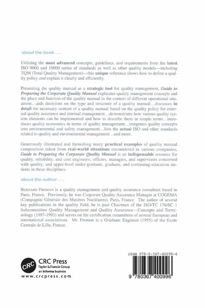 Utilizes advanced concepts, guidelines and requirements from the latest ISO 9000 and 10000 series of standards, as well as other models, including TQM (Total Quality Managment). The text shows how to define a policy and explain it clearly. It offers procedures for developing a quality manual, to be used by personnel performing quality-related funct