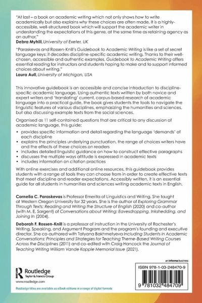 Paraskevas and Rossen-Knill's Guidebook to Academic Writing is like a set of secret language keys: it decodes discipline-specific academic writing. Thanks to their well-chosen, accessible and authentic examples, Guidebook to Academic Writing offers essential reading for instructors and students hoping to make and to support informed choices about writing.