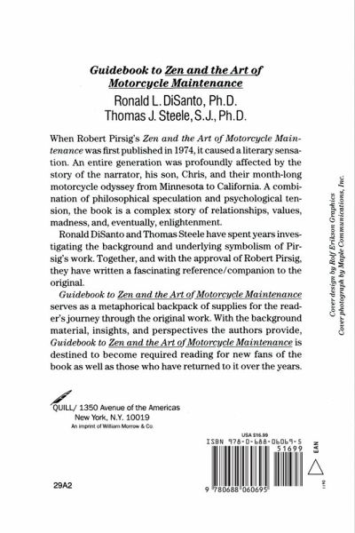 When Robert Pirsig’s Zen and the Art of Motorcycle Maintenance was first published in 1974, it caused a literary sensation. An entire generation was profoundly affected by the story of the narrator, his son, Chris, and their month-long motorcycle odyssey from Minnesota to California. A combination of philosophical speculation and psychological tension, the book is a complex story of relationships, values, madness, and, eventually, enlightenment. Ron Di Santo and Tom Steele have spent years investigating the background and underlying symbolism of Pirsig’s work. Together, and with the approval of Robert Pirsig, they have written a fascinating reference/companion to the original. Guidebook to Zen and the Art of Motorcycle Maintenance serves as a metaphorical backpack of supplies for the reader’s journey through the original work. With the background material, insights, and perspectives the authors provide, Guidebook to Zen and the Art of Motorcycle Maintenance is destined to become required reading for new fans of the book as well as those who have returned to it over the years.