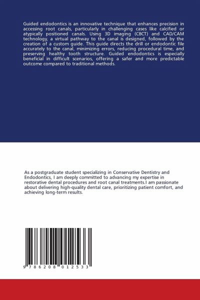 Guided endodontics is an innovative technique that enhances precision in accessing root canals, particularly in challenging cases like calcified or atypically positioned canals. Using 3D imaging (CBCT) and CAD/CAM technology, a virtual pathway to the canal is designed, followed by the creation of a custom guide. This guide directs the drill or endodontic file accurately to the canal, minimizing errors, reducing procedural time, and preserving healthy tooth structure. Guided endodontics is especially beneficial in difficult scenarios, offering a safer and more predictable outcome compared to traditional methods.