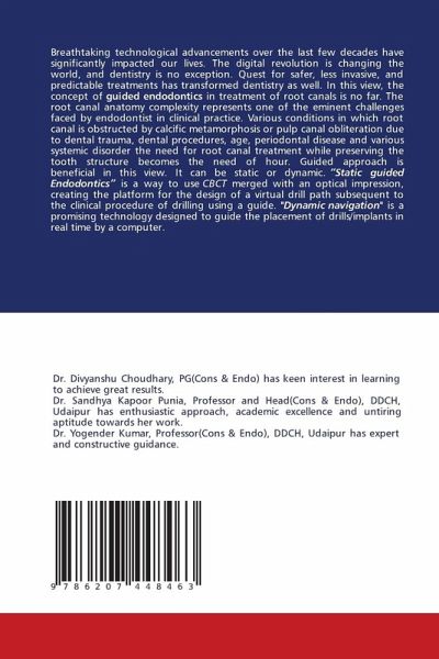 Breathtaking technological advancements over the last few decades have significantly impacted our lives. The digital revolution is changing the world, and dentistry is no exception. Quest for safer, less invasive, and predictable treatments has transformed dentistry as well. In this view, the concept of guided endodontics in treatment of root canals is no far. The root canal anatomy complexity represents one of the eminent challenges faced by endodontist in clinical practice. Various conditions in which root canal is obstructed by calcific metamorphosis or pulp canal obliteration due to dental trauma, dental procedures, age, periodontal disease and various systemic disorder the need for root canal treatment while preserving the tooth structure becomes the need of hour. Guided approach is beneficial in this view. It can be static or dynamic. "Static guided Endodontics" is a way to use CBCT merged with an optical impression, creating the platform for the design of a virtual drill path subsequent to the clinical procedure of drilling using a guide. "Dynamic navigation" is a promising technology designed to guide the placement of drills/implants in real time by a computer.