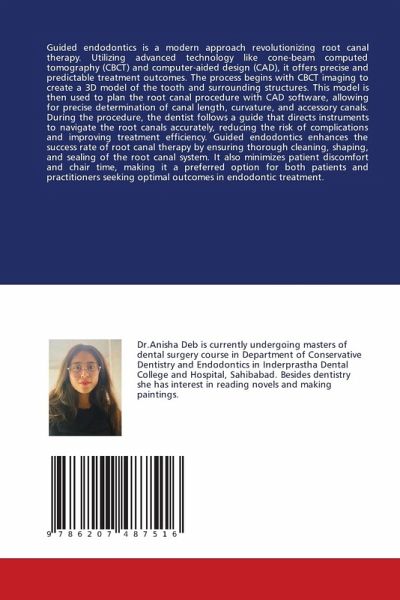 Guided endodontics is a modern approach revolutionizing root canal therapy. Utilizing advanced technology like cone-beam computed tomography (CBCT) and computer-aided design (CAD), it offers precise and predictable treatment outcomes. The process begins with CBCT imaging to create a 3D model of the tooth and surrounding structures. This model is then used to plan the root canal procedure with CAD software, allowing for precise determination of canal length, curvature, and accessory canals. During the procedure, the dentist follows a guide that directs instruments to navigate the root canals accurately, reducing the risk of complications and improving treatment efficiency. Guided endodontics enhances the success rate of root canal therapy by ensuring thorough cleaning, shaping, and sealing of the root canal system. It also minimizes patient discomfort and chair time, making it a preferred option for both patients and practitioners seeking optimal outcomes in endodontic treatment.