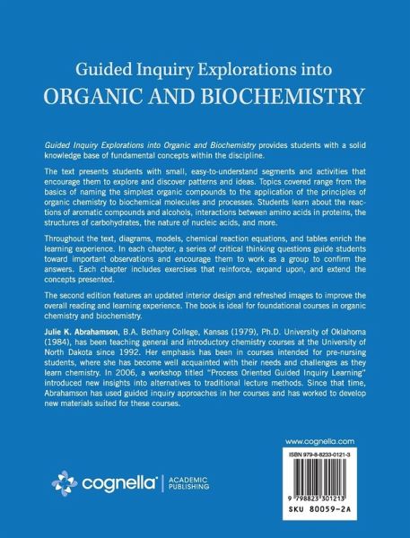 Guided Inquiry Explorations into Organic and Biochemistry provides students with a solid knowledge base of fundamental concepts within the discipline. The text presents students with small, easy-to-understand segments and activities that encourage them to explore and discover patterns and ideas. Topics covered range from the basics of naming the simplest organic compounds to the application of the principles of organic chemistry to biochemical molecules and processes. Students learn about the reactions of aromatic compounds and alcohols, interactions between amino acids in proteins, the structures of carbohydrates, the nature of nucleic acids, and more. Throughout the text, diagrams, models, chemical reaction equations, and tables enrich the learning experience. In each chapter, a series of critical thinking questions guide students toward important observations and encourage them to work as a group to confirm the answers. Each chapter includes exercises that reinforce, expand upon, and extend the concepts presented. The second edition features an updated interior design and refreshed images to improve the overall reading and learning experience. The book is ideal for foundational courses in organic chemistry and biochemistry.