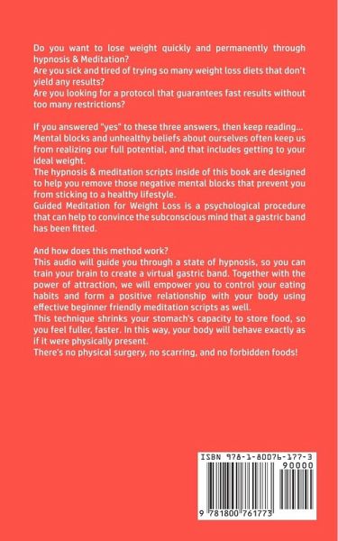 Do you want to lose weight quickly and permanently through hypnosis & Meditation? Are you sick and tired of trying so many weight loss diets that don't yield any results? Are you looking for a protocol that guarantees fast results without too many restrictions? If you answered "yes" to these three answers, then keep reading... Mental blocks and unhealthy beliefs about ourselves often keep us from realizing our full potential, and that includes getting to your ideal weight. The hypnosis & meditation scripts inside of this book are designed to help you remove those negative mental blocks that prevent you from sticking to a healthy lifestyle. Guided Meditation for Weight Loss is a psychological procedure that can help to convince the subconscious mind that a gastric band has been fitted. And how does this method work? This audio will guide you through a state of hypnosis, so you can train your brain to create a virtual gastric band. Together with the power of attraction, we will empower you to control your eating habits and form a positive relationship with your body using effective beginner friendly meditation scripts as well. This technique shrinks your stomach's capacity to store food, so you feel fuller, faster. In this way, your body will behave exactly as if it were physically present. There's no physical surgery, no scarring, and no forbidden foods! In this book, you will find: Improve your body image Remove cravings for unhealthy foods Help you visualize your weight loss goals Increase your desire for exercise Sleep better and reduce weight loss related anxiety and stress Change your life for good And much, much more! Hypnosis & Meditation has been used for centuries to cure many ailments, including the inability to get better sleep. You can help yourself improve the quality of your life with hypnosis & meditation now, even if you are a beginner. What are you waiting for? Click the "Buy Now" button, and start your weight loss journey NOW!