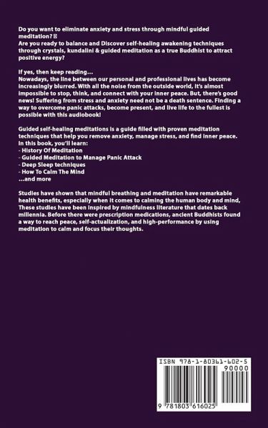 Do you want to eliminate anxiety and stress through mindful guided meditation? Are you ready to balance and Discover self-healing awakening techniques through crystals, kundalini & guided meditation as a true Buddhist to attract positive energy? If yes, then keep reading... Nowadays, the line between our personal and professional lives has become increasingly blurred. With all the noise from the outside world, it's almost impossible to stop, think, and connect with your inner peace. But, there's good news! Suffering from stress and anxiety need not be a death sentence. Finding a way to overcome panic attacks, become present, and live life to the fullest is possible with this audiobook! Guided self-healing meditations is a guide filled with proven meditation techniques that help you remove anxiety, manage stress, and find inner peace. In this book, you'll learn: ¿History Of Meditation ¿Guided Meditation to Manage Panic Attack ¿Deep Sleep techniques ¿How To Calm The Mind ...and more Studies have shown that mindful breathing and meditation have remarkable health benefits, especially when it comes to calming the human body and mind, These studies have been inspired by mindfulness literature that dates back millennia. Before there were prescription medications, ancient Buddhists found a way to reach peace, self-actualization, and high-performance by using meditation to calm and focus their thoughts.