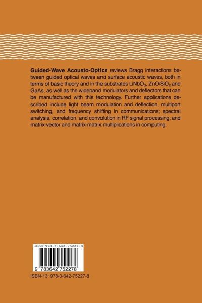 Guided-Wave Acoustooptics reviews Bragg interactions between guided optical waves and acoustic waves, both in terms of basic theory and in the substrates LiNbO3, ZnO/SiO2 and GaAs, as well as the sideband modulators and deflectors that can be manufactured with this technology. Further applications described include light beam modulation and deflection, multiport switching in communications and spectral analysis, correlation and convolution in RF signal processing.
