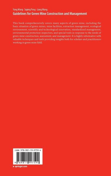 This book comprehensively covers many aspects of green mine, including the basic situation of green mines, mine facilities, extraction management, ecological environment, scientific and technological innovation, standardized management, environmental protection inspectors, and special tools in response to the needs of green mine construction, assessment, and management. It is highly informative with valuable techniques and tools providing insights both for scholars and practitioners working in green mine field.
