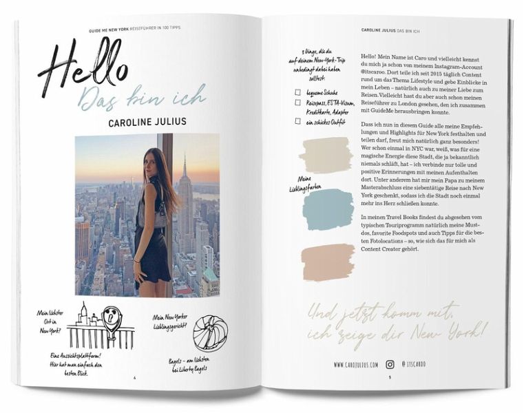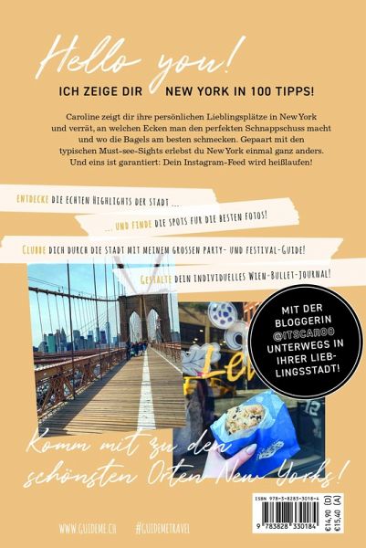NEW YORK IN 100 TIPPS. Caroline Julius, als @itscaroo auf Instagram, nimmt dich mit durch die Szeneviertel der Stadt, zeigt die trendigsten Cafés in Brooklyn und die angesagtesten Boutiquen im East Village. Atemberaubende Fotomotive werden von Fototipps begleitet. So erlebt man auch ikonische Sehenswürdigkeiten wie Freiheitsstatue und Central Park neu. Ausgelassene Partynächte garantieren der große Clubbing-Guide sowie Festivalempfehlungen. Praktisch: das handliche Format und die herausnehmbare Faltkarte. Und eins ist garantiert: Dein Instagram-Feed wird heißlaufen! Im modernen Design, mit individuellen Illustrationen und freien Kreativseiten ist der GuideMe Reiseführer New York auch ein echter Hingucker und stylisher Begleiter.