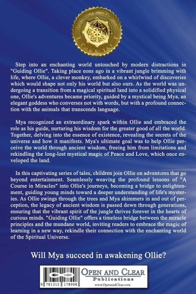 A series of enjoyable and educational stories designed to teach young readers the lessons of "A Course in Miracles" - Long ago, in a jungle untouched by modern distractions, a clever monkey named Ollie embarked on a destiny-altering journey. Guided by the mystical being Mya, who shifted forms from animal to human baby, they shared a profound connection transcending words. Mya nurtured Ollie's wisdom, urging him to explore the essence of existence, to embrace the secrets of manifestation and inspiration. Mya's mission was to unveil ancient wisdom to Ollie, freeing him from limitations and rekindling the jungle's lost magic. Ollie's adventures weren't mere tales but conduits of enlightenment for children, weaving profound lessons seamlessly into whimsical stories. These stories bridged the mystical and the mundane, igniting young minds with the magic of learning and reconnecting them with the enchanting world. As Ollie swung through trees and Mya shimmered, ancient wisdom's legacy persisted, ensuring the jungle's vibrant spirit thrived in curious hearts for generations to come.