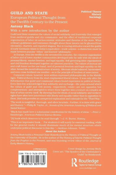 Guild and State examines the values of social solidarity and fraternity that emerged from medieval guilds and city-communes, and the effect of traditional corporate organization of labor on socioeconomic attitudes and theories of the state. What ordinary guildsmen and townsmen thought about these issues can be gleaned from chronicles, charters, and reported slogans. But in tracing attitudes toward the guilds of early Germanic times to today's equivalent-trade unions-a distinction must be made between popular "ethos" and learned "philosophy." In Europe, from the twelfth to the seventeenth centuries, the corporate organization of labor and of town-market communities developed side-by-side with the ideals of personal liberty, market freedom, and legal equality. Both affected the ideology of the European commune and city-state in specific and discernible ways. Self-governing labor organizations and civil freedom developed together as coherent practices. The values of mutual aid and craft honor on the one hand, and of personal freedom and legal equality on the other, formed the moral infrastructure of our civilization. Alternate ideals balanced, harmonized, and even cross-fertilized one another-as in the principle of freedom of association.Contrary to preconceptions, however, corporate values were seldom expressed philosophically in the Middle Ages. Political theory and the world of learning from the start emphasized liberal values. It was only after the Reformation that guild and communal values found expression in political theory. Even then only a few philosophers acknowledged that solidarity and exchange-the poles around which the values of guild and civil society, respectively, rotate-are not opposites but complementary, and attempted to weave these together into a texture as tough and complex as that of urban society itself. The Enlightenment and industrialization led to an apotheosis of liberal values. Guilds disappeared and were only in part replaced by labor unions; the values of market exchange have since been in the ascendant-though Hegel, Durkheim, and more recently, advocates of liberal corporatism maintain the possibility of a symbiosis between corporate and liberal values. In Guild and State there emerges an alternative history of political thought, which will be fascinating to the general as well as the specialist reader.
