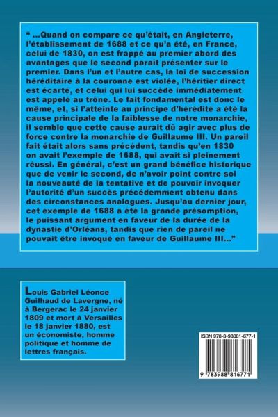 " ...Quand on compare ce qu'était, en Angleterre, l'établissement de 1688 et ce qu'a été, en France, celui de 1830, on est frappé au premier abord des avantages que le second paraît présenter sur le premier. Dans l'un et l'autre cas, la loi de succession héréditaire à la couronne est violée, l'héritier direct est écarté, et celui qui lui succède immédiatement est appelé au trône. Le fait fondamental est donc le même, et, si l'atteinte au principe d'hérédité a été la cause principale de la faiblesse de notre monarchie, il semble que cette cause aurait dû agir avec plus de force contre la monarchie de Guillaume III. Un pareil fait était alors sans précédent, tandis qu'en 1830 on avait l'exemple de 1688, qui avait si pleinement réussi. En général, c'est un grand bénéfice historique que de venir le second, de n'avoir point contre soi la nouveauté de la tentative et de pouvoir invoquer l'autorité d'un succès précédemment obtenu dans des circonstances analogues. Jusqu'au dernier jour, cet exemple de 1688 a été la grande présomption, le puissant argument en faveur de la durée de la dynastie d'Orléans, tandis que rien de pareil ne pouvait être invoqué en faveur de Guillaume III..."