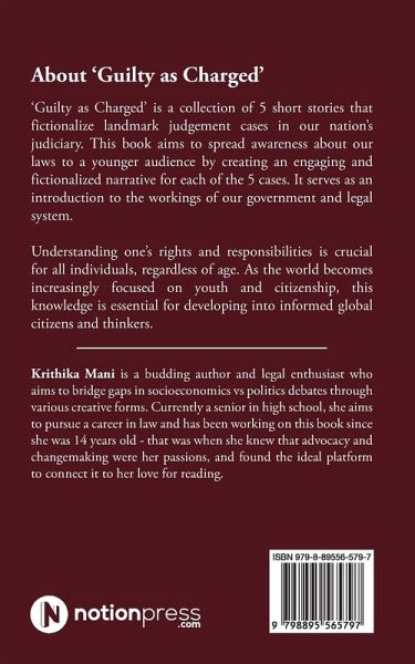 About 'Guilty as Charged' 'Guilty as Charged' is a collection of 5 short stories that fictionalize landmark judgement cases in our nation's judiciary. This book aims to spread awareness about our laws to a younger audience by creating an engaging and fictionalized narrative for each of the 5 cases. It serves as an introduction to the workings of our government and legal system. Understanding ones rights and responsibilities is crucial for all individuals, regardless of age. As the world becomes increasingly focused on youth and citizenship, this knowledge is essential for developing into informed global citizens and thinkers.