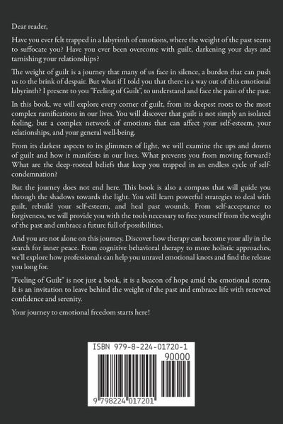 Dear reader, Have you ever felt trapped in a labyrinth of emotions, where the weight of the past seems to suffocate you? Have you ever been overcome with guilt, darkening your days and tarnishing your relationships? The weight of guilt is a journey that many of us face in silence, a burden that can push us to the brink of despair. But what if I told you that there is a way out of this emotional labyrinth? I present to you "Feeling of Guilt", to understand and face the pain of the past. In this book, we will explore every corner of guilt, from its deepest roots to the most complex ramifications in our lives. You will discover that guilt is not simply an isolated feeling, but a complex network of emotions that can affect your self-esteem, your relationships, and your general well-being. From its darkest aspects to its glimmers of light, we will examine the ups and downs of guilt and how it manifests in our lives. What prevents you from moving forward? What are the deep-rooted beliefs that keep you trapped in an endless cycle of self-condemnation? But the journey does not end here. This book is also a compass that will guide you through the shadows towards the light. You will learn powerful strategies to deal with guilt, rebuild your self-esteem, and heal past wounds. From self-acceptance to forgiveness, we will provide you with the tools necessary to free yourself from the weight of the past and embrace a future full of possibilities. And you are not alone on this journey. Discover how therapy can become your ally in the search for inner peace. From cognitive behavioral therapy to more holistic approaches, we'll explore how professionals can help you unravel emotional knots and find the release you long for. "Feeling of Guilt" is not just a book, it is a beacon of hope amid the emotional storm. It is an invitation to leave behind the weight of the past and embrace life with renewed confidence and serenity. Your journey to emotional freedom starts here!