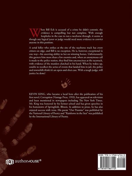 When Bill Eck is accused of a crime he didn't commit, the evidence is compelling but not complete. With enough loopholes in the case to run a racehorse through, it seems as though any logical juror or judge would need more evidence to convict anyone in this position. A serial killer who strikes at the site of the racehorse track has every citizen on edge, and Bill is no exception. He is, however, exceptional in one way--his unerring ability to bet on winning horses. Unfortunately, this garners him more than a few enemies and, when an anonymous call is made to the police station, they find him unconscious at the racetrack, with evidence of the murders clutched in his hand. When he wakes up, unable to recollect the series of events that landed him in jail, the police and townsfolk think it's an open-and-shut case. With a tough judge, will justice be done? Kevin King's Guilty of Nothing provides not only a page-turning, gripping story, but also a scathing indictment of our so-called "justice system."