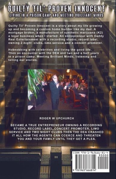 Guilty Til' Proven Innocent is a story about my life growing up and becoming a custom home builder like my dad. A mortgage broker, a manufacture of synthetic marijuana (K2) a legal business when I started. An entrepreneur with Daddy Real Entertainment with a recording studio, record label, owning 2 night clubs, limo service and a concert promoter. Hobnobbing with celebrities and living the good life. Then an encounter with the DEA and two and a half years in a prison camp. Meeting Brilliant Minds, listening and telling our stories.