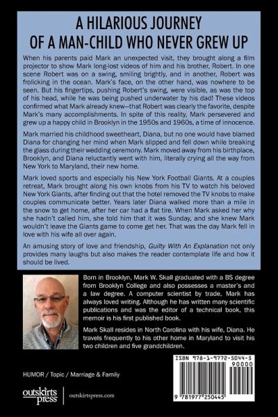 When his parents paid Mark an unexpected visit, they brought along a film projector to show Mark long-lost videos of him and his brother, Robert. In one scene Robert was on a swing, smiling brightly, and in another, Robert was frolicking in the ocean. Mark's face, on the other hand, was nowhere to be seen. But his fingertips, pushing Robert's swing, were visible, as was the top of his head, while he was being pushed underwater by his dad! These videos confirmed what Mark already knew-that Robert was clearly the favorite, despite Mark's many accomplishments. In spite of this reality, Mark persevered and grew up a happy child in Brooklyn in the 1950s and 1960s, a time of innocence. Mark married his childhood sweetheart, Diana, but no one would have blamed Diana for changing her mind when Mark slipped and fell down while breaking the glass during their wedding ceremony. Mark moved away from his birthplace, Brooklyn, and Diana reluctantly went with him, literally crying all the way from New York to Maryland, their new home. Mark loved sports and especially his New York Football Giants. At a couples retreat, Mark brought along his own knobs from his TV to watch his beloved New York Giants, after finding out that the hotel removed the TV knobs to make couples communicate better. Years later Diana walked more than a mile in the snow to get home, after her car had a flat tire. When Mark asked her why she hadn't called him, she told him that it was Sunday, and she knew Mark wouldn't leave the Giants game to come get her. That was the day Mark fell in love with his wife all over again. An amusing story of love and friendship, Guilty With An Explanation not only provides many laughs but also makes the reader contemplate life and how it should be lived.