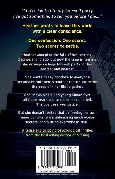 "You're invited to my farewell party. I've got something to tell you before I die..." Heather wants to leave this world with a clear conscience. One confession. One secret. Two scores to settle. Heather accepted the fate of her terminal diagnosis long ago, but now the time is nearing, she arranges a huge farewell party for her nearest and dearest. She wants to say goodbye to everyone personally, but there's another reason she wants the people in her life to gather. She knows who killed young Simon Eyre all those years ago, and she needs to tell. The boy deserves justice. But she doesn't realise that by freeing her own inner demons, she's unleashing much worse secrets, and putting everyone at risk...