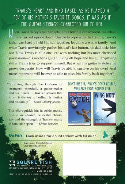 Travis Tacey doesn't have it easy: his mom's in the hospital suffering from brain trauma after a terrible car accident, and his father has lost his good sense in the aftermath and kicked him out. Homeless, penniless, and only fourteen years old, Travis tries to make money off of his singing and guitar playing skills. But when his beloved guitar-a family heirloom-is stolen, Travis grows desperate. By a stroke of luck, he gets a job helping a guitar maker. Through Travis's love of music, his devotion to his family, and the kindness of strangers, he begins to find his way in the world. But in Guitar Boy by MJ Auch, how will he keep his family together?