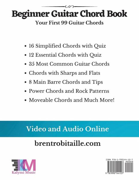 A Better Way To Learn Guitar Chords? Learn your first 99+ guitar chords quickly using Brent's visual system tried and tested with thousands of students. Designed for the complete beginner to intermediate level guitar players of any age. The chords you will learn are the most frequently played chords in pop, country, folk, and rock guitar playing. Start off learning the 16 easy 1, 2, and 3 finger chords, then move on to the 12 essential chords all guitarists must know. Make sure to take all the visual quizzes to help memorize these important chord shapes! Next comes 35 more commonly used chords, followed by the 16 sharps and flats chords. After you have a good grasp of these chords, you can start to focus on playing barre chords. Brent has included 7 tips to master barre chords with accompanying exercises. If you are into rock music, work on the 4 main power chords with some great little song patterns. Then on to the 8 moveable chords that you can transpose up and down the guitar neck. Also, three of the most important charts you will ever need are included: the major key chart showing the chords in each key (which is great for learning or writing your own songs); a handy capo chart to help you transpose to any key; the all-important guitar fingerboard charts, so you know where you are going. As an added bonus, there are three different printable blank guitar chord charts to add more chords to your repertoire or just write down your favourite songs. The Beginner Guitar Chord Book will you get jamming in no time. Check out Brent's website for the accompanying video and audio tracks, plus a good selection of guitar books and free lessons.