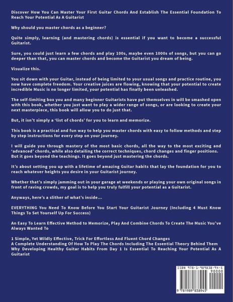 Discover How You Can Master Your First Guitar Chords And Establish The Essential Foundation To Reach Your Potential As A Guitarist Why should you master chords as a beginner? Quite simply, learning (and mastering chords) is essential if you want to become a successful Guitarist. Sure, you could just learn a few chords and play 100s, maybe even 1000s of songs, but you can go deeper than that, you can master chords and become the Guitarist you dream of being. Visualize this. You sit down with your Guitar, instead of being limited to your usual songs and practice routine, you now have complete freedom. Your creative juices are flowing, knowing that your potential to create incredible Music is no longer limited, your potential has finally been unleashed. The self-limiting box you and many beginner Guitarists have put themselves in will be smashed open with this book, whether you just want to play a wider range of songs, or are looking to create your next masterpiece, this book will allow you to do just that. But, it isn't simply a 'list of chords' for you to learn and memorize. This book is a practical and fun way to help you master chords with easy to follow methods and step by step instructions for every step on your journey. I will guide you through mastery of the most basic chords, all the way to the most exciting and 'advanced' chords, while also detailing the correct techniques, chord changes and finger positions. But it goes beyond the teachings. It goes beyond just mastering the chords. It's about setting you up with a lifetime of amazing Guitar habits that lay the foundation for you to reach whatever heights you desire in your Guitarist journey. Whether that's simply jamming out in your garage at weekends or playing your own original songs in front of raving crowds, my goal is to help you truly fulfill your potential as a Guitarist. Here's a slither of what's inside... * EVERYTHING You Need To Know Before You Start Your Guitarist Journey (Including 4 Must Know Things To Set Yourself Up For Success) * The Must Know Practice Routine To Skyrocket Your Results In LESS Time! * 1 Simple Trick For Effortless And Fluent Chord Changes * A Complete Understanding Of How To Play The Chords Including The Essential Theory Behind Them * Why Developing Healthy Guitar Habits From Day 1 Is Essential To Reaching Your Potential As A Guitarist * Think You Need To Learn Endless Amounts Of Music Theory Before You Start Playing? Think Again. (And Inside You'll Discover What To Do Instead) * What Professional Guitarists Use To Maximize Their Playing Ability, That You Aren't Utilizing * Exactly What To Do Once You Master Your First 100 Chords And Take Your Guitarist Journey To The Next Level And that is BARELY scratching the surface! This book is looking to go beyond simply learning the basics of Guitar and stopping there.
