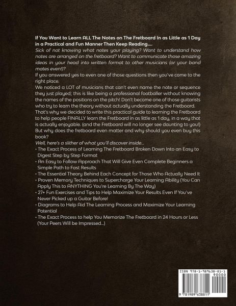 If You Want to Learn ALL The Notes on The Fretboard In as Little as 1 Day in a Practical and Fun Manner Then Keep Reading…. Sick of not knowing what notes your playing? Want to understand how notes are arranged on the fretboard? Want to communicate those amazing ideas in your head into written format to other musicians (or your band mates even!)? If you answered yes to even one of those questions then you’ve come to the right place. We noticed a LOT of musicians that can’t even name the note or sequence they just played; this is like being a professional footballer without knowing the names of the positions on the pitch! Don’t become one of those guitarists who try to learn the theory without actually understanding the Fretboard. That’s why I decided to write this practical guide to learning the Fretboard to help people FINALLY learn the Fretboard in as little as 1 day, in a way that is actually enjoyable. (and the Fretboard will no longer see daunting to you!) But why does the fretboard even matter and why should you even buy this book? Well, here’s a slither of what you’ll discover inside… The Exact Process of Learning The Fretboard Broken Down Into an Easy to Digest Step by Step Format An Easy to Follow Approach That Will Give Even Complete Beginners a Simple Path to Fast Results The Essential Theory Behind Each Concept for Those Who Actually Need It Proven Memory Techniques to Supercharge Your Learning Ability (You Can Apply This to ANYTHING You’re Learning By The Way) 27+ Fun Exercises and Tips to Help Maximize Your Results Even If You’ve Never Picked up a Guitar Before! Diagrams to Help Aid The Learning Process and Maximize Your Learning Potential The Exact Process to help You Memorize The Fretboard in 24 Hours or Less (Your Peers Will be Impressed…) And that is barely scratching the surface! Even if you have NO IDEA what notes you are playing, even if you’ve NEVER picked up a Guitar in your life and even if you’ve never been able to communicate your musical ideas in written form this book will show you EXACTLY how you can master the Fretboard in almost no time at all. So, If You Want to Maximize Your Potential as a Musician by Learning The Fretboard in 1 Day or Less Then Scroll Up and Click "Add to Cart."