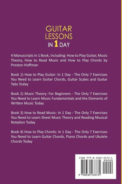 4 Manuscripts in 1 Book, Including: How to Play Guitar, Music Theory, How to Read Music and How to Play Chords! Book 1) How to Play Guitar: In 1 Day - The Only 7 Exercises You Need to Learn Guitar Chords, Guitar Scales and Guitar Tabs Today Book 2) Music Theory: For Beginners - The Only 7 Exercises You Need to Learn Music Fundamentals and the Elements of Written Music Today Book 3) How to Read Music: In 1 Day - The Only 7 Exercises You Need to Learn Sheet Music Theory and Reading Musical Notation Today Book 4) How to Play Chords: In 1 Day - The Only 7 Exercises You Need to Learn Guitar Chords, Piano Chords and Ukulele Chords Today You have made an excellent decision by choosing to learn guitar. So, don't delay it any longer. Take this opportunity and purchase your copy today. Order "Guitar Lessons: In 1 Day" Now!