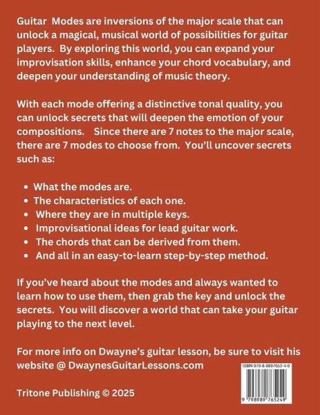 Guitar Modes Unlock The Secrets is a how-to guide book that will allow you to unlock the secrets of the guitar modes. A system of unique note interals taken from the major scale that allow you to discover a wonderful world of musical possibilities. They offer unique tone qualities and characteristics that can add a wealth of flavor to your playing. As they are used in a wide variety of musical styles. What is great about the modes is that each one has a unique sequence of intervals that give them a very distinctive sound of their own. With practice, you get familiar with their patterns in different keys across the fretboard. This not only helps you to master the modes individually but also enhances your fretboard knowledge, ear training, and music theory. Unlocking the secrets that will lead you to new dimensions of creativity and self-expression. The interval note sequence can be broken down into a pattern (or scientific formula, if you will) of whole-steps and half-steps. And it's these patterns that give each one a distinctive musical voicing. It is this distinctive voicing of each mode that will be explored in this training. You will learn and familiarize yourself with the note pattern of each mode and grasp its unique sound so that you can use it to create music of your own. With this clear and concise, step-by-step method of study, you will discover a whole new world of possibilities. You'll just need the desire to learn, study, and practice. If you have that, there is no limit to what you can accomplish. So, grab your guitar and follow this guide like a map to a hidden treasure. Before you know it, you will be playing like you never thought possible. Good luck and don't forget to have fun.