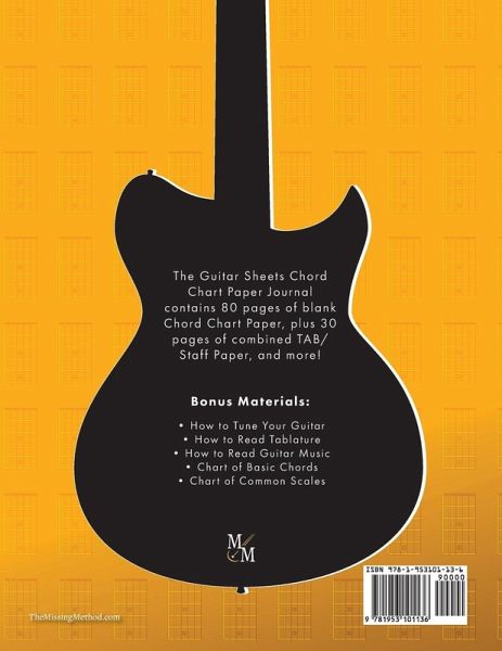 The perfect blank chord chart book for any guitar player, guitar teacher, or guitar student! Every guitar player, regardless of experience, needs to be able to write down things they're learning, from songs they're working on, to their own music. With the Guitar Sheets Chord Chart Paper Journal from The Missing Method for Guitar, you'll have the space you need to write down newly discovered chord voicings, new chords to learn, chords to your favorite songs, or create your own chords. Included in this book:80 pages of Chord Chart paper (16 per page) 30 additional pages that combine both tab and staff paper (6 per page) 8.5 x 11" bound paperback with premium glossy cover It's one big book of chord chart paper and more! Also included:How to tune your guitar A chart featuring all the basic chords Major and minor scales, including harmonic minor Pentatonic Scales How to read tablature How to read standard notation Remember: besides practice, nothing helps you learn and process new information better than taking time to write things down. Order your copy today!
