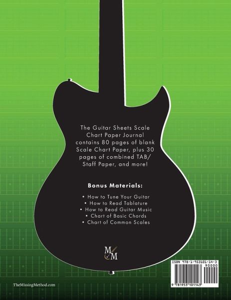 The perfect blank scale chart book for any guitar player, guitar teacher, or guitar student! Every guitar player, regardless of experience, needs to be able to write down what they're learning, from songs they're working on, to scales, to their own music. With Guitar Sheets Scale Chart Paper from The Missing Method for Guitar you'll be able to write down new scales to learn or invent your own. Included in this book:80 pages of Scale Chart paper (5 per page) 30 additional pages that combine both tab and staff paper (6 per page) 8.5 x 11" bound paperback with premium glossy cover It's one big book of scale chart paper and more! Also included:How to tune your guitar A chart featuring all the basic chords Major and minor scales, including harmonic minor Pentatonic Scales How to read tablature How to read standard notation Remember: besides practice, nothing helps you learn and process new information better than taking time to write things down. Order your copy today!
