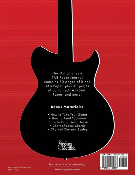 The perfect TAB book for any guitar player, guitar teacher, or guitar student! Every guitar player, regardless of experience, needs to be able to write down things they're learning, from songs they're working on, to their own music. Now you have a way of keeping it organized with Guitar Sheets: TAB Paper from The Missing Method for Guitar. Included in this book:80 pages of guitar tablature (10 lines of tab per page) 30 pages that combine both tab and staff paper (6 per page) 8.5 x 11" bound paperback with premium matte cover It's one big book of blank TABS, plus more! Also included:How to tune A chart featuring all the basic chords Major and minor scales, including harmonic minor Pentatonic Scales How to read tablature How to read standard notation Remember: besides practice, nothing helps you learn and process new information better than taking time to write things down. So scroll up and order your copy today!