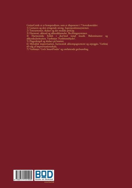 GuitarGuide er et kompendium, som er disponeret i 7 hovedområder:1) Guitaren og den svingende streng. Superpositionssystemet.2) Tonesystemer, skalaer og det modale princip.3) Harmoni, akkord og akkorddannelse. Becifringssystemet.4) Harmoniske forløb i dur/mol tonal musik. Bidominanter og akkordsubstitution. Værktøjet 'Funktionshjulet'.5) Flageoletspil og skalaer på brættet.6) Melodisk improvisation, harmonisk akkompagnement og arpeggio. Værktøj til valg af improvisationsskala.7) Værktøjet 'Greb SmartFinder' og omfattende grebsamling.