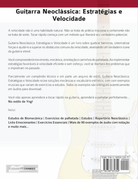 Guitarra Neoclássica: Estratégias e Velocidade A velocidade não é uma habilidade natural. Não se trata de prática irracional e certamente não se trata de sorte. Tocar rápido começa com um método que liberará seu verdadeiro potencial. Guitarra Neoclássica: Estratégias e Velocidade é um livro sobre quebrar barreiras, sistematizar forças e ajudá-lo a superar os obstáculos comuns da velocidade, analisando um verdadeiro ícone da guitarra shred. Você compreenderá movimento, mecânica, orientação e caminhos de palhetada. Ao implementar estratégias favoráveis à velocidade eficiente e sem esforço, você se libertará dos problemas que o impediram no passado. Parcialmente um compêndio técnico e em parte um arquivo de estilo, Guitarra Neoclássica: Estratégias e Velocidade reúne soluções mecânicas e vocabulário estilístico, com cem exemplos musicais que variam de exercícios a estudos. Todos os exemplos são entregues autenticamente em áudios para download. Você não apenas aprenderá a tocar rápido na guitarra, aprenderá a palhetar perfeitamente... No estilo de Yng! Inclui: Estudos de Biomecânica Exercícios de palhetada Estudos Repertório Neoclássico Licks Emocionantes Exercícios Essenciais Mais de 90 exemplos de áudio com notação e muito mais...