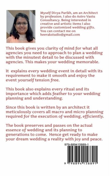 This book gives you clarity of mind for what all agencies you need to approach to plan a wedding with the minutest detail to be discussed with agencies. This makes your wedding memorable. It explains every wedding event in detail with its requirement to make it smooth and enjoy the event yourself tension free. This book also explains every ritual and its importance which adds feather to your wedding planning and understanding. Since this book is written by an architect it meticulously covers all macro and micro planning required for the execution of wedding, efficiently. The book preserves and passes on the actual essence of wedding and its planning to generations to come. Hence get ready to make your dream wedding a reality with joy and peace.