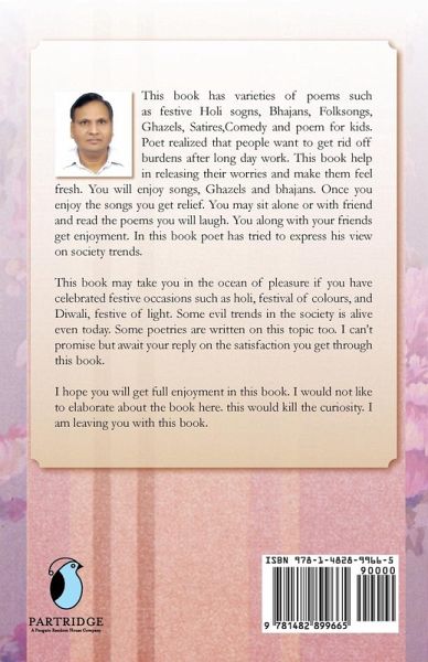 This book has varieties of poems such as festive Holi sogns, Bhajans, Folksongs, Ghazels, Satires,Comedy and poem for kids. Poet realized that people want to get rid off burdens after long day work. This book help is releasing their worries and make them feel fresh. You will enjoy songs, Ghazels and bhajans if you are perform prayer. Once you enjoy the songs you get releife. You may sit alone or with friend and read the poems. You along with your friends get enjoyment. In this book poet has tried to express his view on society trends. This book may take you in the ocean of pleasure if you have celebrated festive occasions such as holi, festival of colours, and Diwali, festive of light. Some evil trends in the society is alive even today. some poetris or written on this topic too. I can't promise but await your reply on the satisfaction you get through this book. I hope you will get full enjoyment in this book. I would not like to elaborate about the book here. this would kill the curousity.I am leaving you with this book.