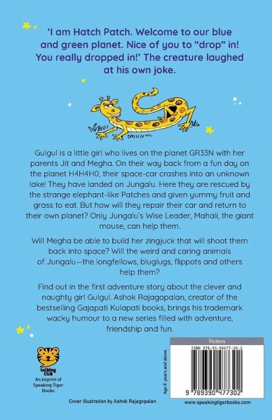 Description Gulgul is a little girl who lives on the planet GR33N with her parents Jit and Megha. On their way back from a fun day on the planet H4H4H0, their spacecar crashes into an unknown lake! They have landed on Jungalu. Here they are rescued by the strange elephant-like Patches and given yummy fruit and grass to eat. But how will they repair their car and return to their own planet? Only Jungalu's Wise Leader, Mahali, the giant mouse, can help them. Will Megha be able to build her zingjuck that will shoot them back into space? Will the weird and caring animals of Jungalu-the longfellows, bluglugs, flippots and others help them? Find out in the first adventure story about the clever and naughty girl Gulgul. Ashok Rajagopalan, creator of the bestselling Gajapati Kulapati books, brings his trademark wacky humour to a new series filled with adventure, friendship and fun.