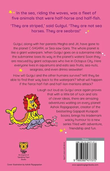 Description Gulgul, along with her parents Megha and Jit, have gone to the planet C-54G4R4, or Sea-saw Gara. The whole planet is like a giant waterpark. When Gulgul goes on a submarine ride, the submarine loses its way in the planet's waters! Soon they are rescued by giant octopuses who live in Octopus City. Here everyone lives in aquariums and eats sea-fruits, sea-nuts, seagrass and even drinks seawater! How will Gulgul and the other humans survive? Will they be able to find their way back to the waterpark? What will happen if the fierce half-fish and halflion merlions attack? Laugh out loud as Gulgul once again proves that with a little bit of luck and lots of clever ideas, there are amazing adventures waiting on every planet! Ashok Rajagopalan, creator of the bestselling Gajapati Kulapati books, brings his trademark wacky humour to a new series filled with adventure, friendship and fun.