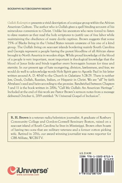 Gullah Redemption presents a vivid description of a unique group within the African American Culture. The author who is Gullah gives a spell binding account of his miraculous conversion to Christ. Unlike his ancestors who were forced to listen to slave masters as they read the holy scriptures to justify use of free labor while maintaining the obedience of many docile captives. Brown suggests that some 75% of Blacks living in the United States remain unaware of his one of a kind group. The Gullah living on seacoast islands bordering mainly South Carolina and Georgia represent a people having the purest bloodline of all African slaves brought to North America in wooden ships. While proud knowledge of the blood of a people is very important, most important is theological knowledge that the blood of Jesus links and binds together every born-again human for time and eternity. In our present age of hate mongering, division, lawlessness, and fear, we would do well to acknowledge words Holy Spirit gave to Apostle Paul in his letter written around A. D. 40-60 to the Church in Galatians 3:28-29. There is neither Jew, Greek, Gullah, Russian, Italian, or Hispanic in Christ. We are "all" by faith Abraham's seed and heirs according to the promise. Sandwiched between Chapters 3 and 11 is the book written in 2006, "Call Me Gullah: An American Heritage". Included at the end of this work are Pastor Brown's sermon notes from a message delivered October 6, 2019 entitled: "A Universal Gospel of Inclusion".
