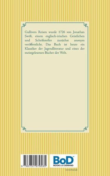 Gullivers Reisen wurde 1726 von Jonathan Swift, einem englisch-irischen Geistlichen und Schriftsteller zunächst anonym veröffentlicht. Das Buch ist heute ein Klassiker der Jugendliteratur und eines der meistgelesenen Bücher der Welt.