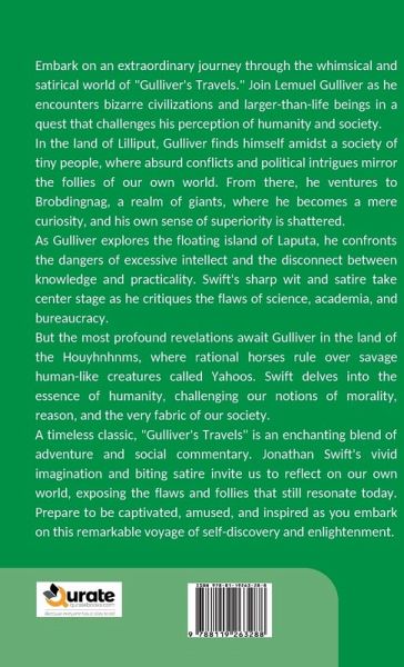 Embark on an extraordinary journey through the whimsical and satirical world of "Gulliver's Travels." Join Lemuel Gulliver as he encounters bizarre civilizations and larger-than-life beings in a quest that challenges his perception of humanity and society. In the land of Lilliput, Gulliver finds himself amidst a society of tiny people, where absurd conflicts and political intrigues mirror the follies of our own world. From there, he ventures to Brobdingnag, a realm of giants, where he becomes a mere curiosity, and his own sense of superiority is shattered. As Gulliver explores the floating island of Laputa, he confronts the dangers of excessive intellect and the disconnect between knowledge and practicality. Swift's sharp wit and satire take center stage as he critiques the flaws of science, academia, and bureaucracy. But the most profound revelations await Gulliver in the land of the Houyhnhnms, where rational horses rule over savage human-like creatures called Yahoos. Swift delves into the essence of humanity, challenging our notions of morality, reason, and the very fabric of our society. A timeless classic, "Gulliver's Travels" is an enchanting blend of adventure and social commentary. Jonathan Swift's vivid imagination and biting satire invite us to reflect on our own world, exposing the flaws and follies that still resonate today. Prepare to be captivated, amused, and inspired as you embark on this remarkable voyage of self-discovery and enlightenment.