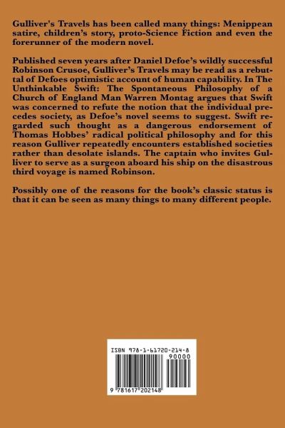 Gulliver's Travels has been called many things: Menippean satire, children's story, proto-Science Fiction and even the forerunner of the modern novel. Published seven years after Daniel Defoe's wildly successful Robinson Crusoe, Gulliver's Travels may be read as a rebuttal of Defoes optimistic account of human capability. In The Unthinkable Swift: The Spontaneous Philosophy of a Church of England Man Warren Montag argues that Swift was concerned to refute the notion that the individual precedes society, as Defoe's novel seems to suggest. Swift regarded such thought as a dangerous endorsement of Thomas Hobbes' radical political philosophy and for this reason Gulliver repeatedly encounters established societies rather than desolate islands. The captain who invites Gulliver to serve as a surgeon aboard his ship on the disastrous third voyage is named Robinson. Possibly one of the reasons for the book's classic status is that it can be seen as many things to many different people. Wilder Publications is a green publisher. All of our books are printed to order. This reduces waste and helps us keep prices low while greatly reducing our impact on the environment.