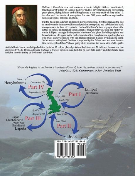 'Gulliver's Travels' is now best known as a tale to delight children. And indeed, Jonathan Swift's story of Lemuel Gulliver and his adventures among tiny people, great giants, flying islands and talking horses is the very stuff of fairy tales. It has charmed the hearts of youngsters for over 300 years and been reprised in numerous books, cartoons and film. But the book has a darker, and much more serious side. Swift conceived the tale as a satire on the human condition and political corruption, and published the book anonymously for fear of reprisals. Each of Gulliver's four voyages allows the author to expose and ridicule some aspect of human behavior, from the futility of war in Lilliput, through the imperfect wisdom of the giant Brobdingnagians and flawed science of Laputa to the perfect society of the Houyhnhnms, speaking horses who Swift contrasts with the degraded human Yahoos living among them. On his return to England, Gulliver is repulsed by his fellow men and sees them as little more civilized than Yahoos, guilty of, in his view, the worse vice of all - pride. Aziloth Book's new, unabridged edition includes 12 colour plates by Arthur Rackham and 78 delicate, humourous line drawings by C. E. Brock, allowing 'Gulliver's Travels' to be enjoyed both for its fairy-tale quality and its bitingly deep insights into the frailty of the human condition.