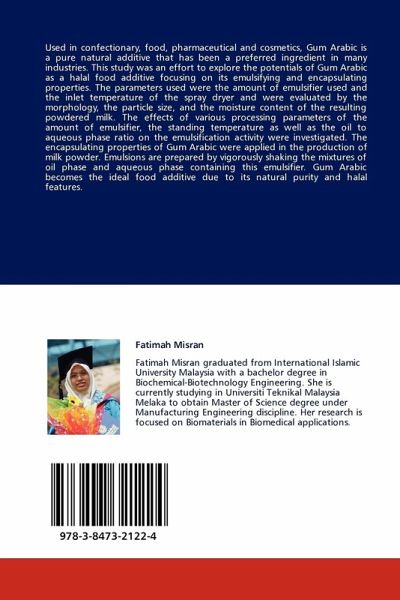 Used in confectionary, food, pharmaceutical and cosmetics, Gum Arabic is a pure natural additive that has been a preferred ingredient in many industries. This study was an effort to explore the potentials of Gum Arabic as a halal food additive focusing on its emulsifying and encapsulating properties. The parameters used were the amount of emulsifier used and the inlet temperature of the spray dryer and were evaluated by the morphology, the particle size, and the moisture content of the resulting powdered milk. The effects of various processing parameters of the amount of emulsifier, the standing temperature as well as the oil to aqueous phase ratio on the emulsification activity were investigated. The encapsulating properties of Gum Arabic were applied in the production of milk powder. Emulsions are prepared by vigorously shaking the mixtures of oil phase and aqueous phase containing this emulsifier. Gum Arabic becomes the ideal food additive due to its natural purity and halal features.