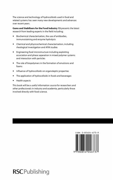 The science and technology of hydrocolloids used in food and related systems has seen many new developments and advances over recent years. Gums and Stabilisers for the Food Industry 13 presents the latest research from leading experts in the field including: * Biochemical characterisation, the use of antibodies, immunostaining and enzyme hydrolysis * Chemical and physicochemical characterisation, including rheological investigation and AFM studies * Engineering food microstructure including exploiting association and phase separation in mixed polymer systems and interaction with particles * The role of biopolymers in the formation of emulsions and foams * Influence of hydrocolloids on organoleptic properties * The application of hydrocolloids in foods and beverages * Health aspects This book will be a useful information source for researchers and other professionals in industry and academia, particularly those involved directly with food science.