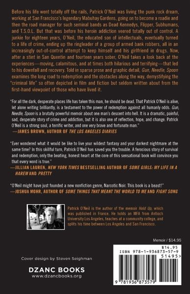 Before his life went totally off the rails, Patrick O'Neil was living the punk rock dream, working at San Francisco's legendary Mabuhay Gardens, going on to become a roadie and then the road manager for such seminal bands as Dead Kennedys, Flipper, Subhumans,and T.S.O.L. But that was before his heroin addiction veered totally out of control. A junkie for eighteen years, O'Neil, the educated son of intellectuals, eventually turned to a life of crime, ending up the ringleader of a group of armed bank robbers, all in an increasingly out-of-control attempt to keep himself and his girlfriend in drugs. Now, after a stint in San Quentin and fourteen years sober, O'Neil takes a look back at the experiences-moving, calamitous, and at times both hilarious and terrifying-that led to his downfall and recovery. Told in sparse prose and graphic detail, Gun, Needle, Spoon examines the long road to redemption and the obstacles along the way, demystifying the "criminal life” so often depicted in film and fiction but seldom written about from the first-hand viewpoint of those who have lived it.